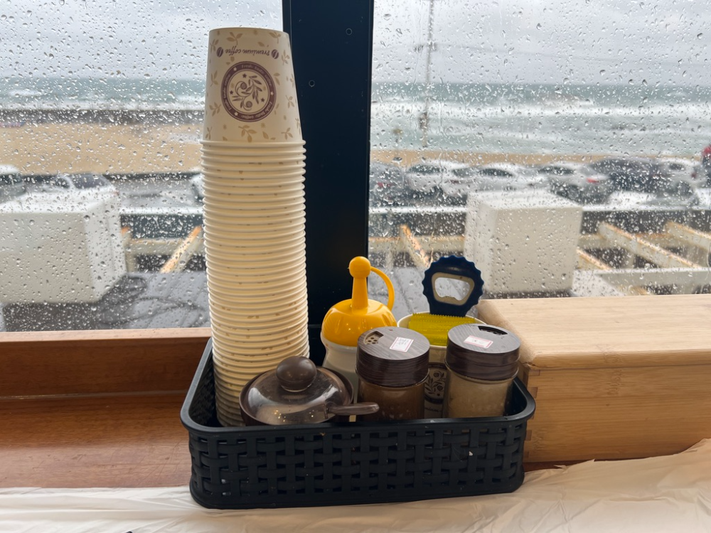 바다뷰가 보이는 곳에 앉을 수 있는데 높은 의자가 있었다. 의자가 푹신해서 음식을 먹는데 불편함은 없었다. 비가 주룩주룩 내리고 있었지만 밖에 보이는 뷰는 볼만했다.