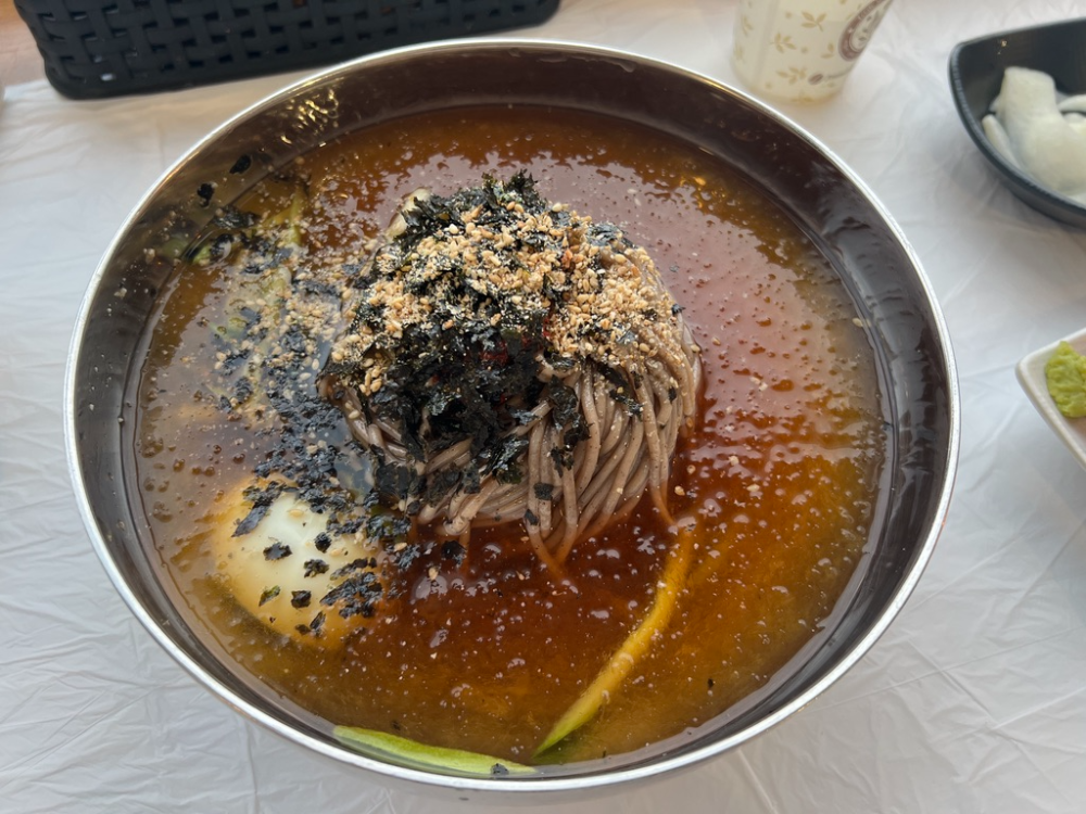 물막국수를 시켜 먹었다. 살얼음이 동동 떠있는 육수 위에 김가루가 솔솔 뿌려져 있다. 메밀로 만든 막국수는 언제 먹어도 부담이 없는 듯하다. 소화도 잘 되고! 모밀을 먹는 기분이라 시원하니 새콤하니 먹을만했다.