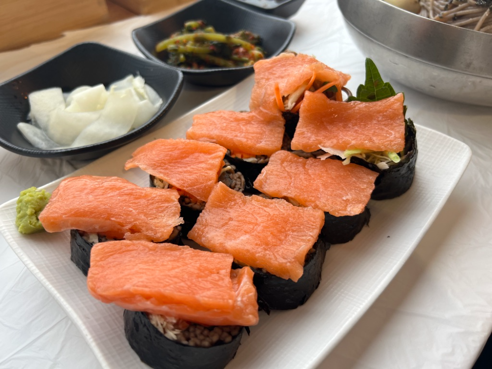 투툼 한 연어에 와사마요소스는 잘 어울렸다. 연어가 김밥 속에 들어가 있었으면 더 맛있었을 것 같다. 근데 메밀이랑은 잘 안 어울리는 것 같기도 하고.. 생각했던 메밀김밥은 생각보다 실망이었다. 맛이 없어서가 아니라 메밀면이 익숙하지 않아서 그랬던 것 같다.