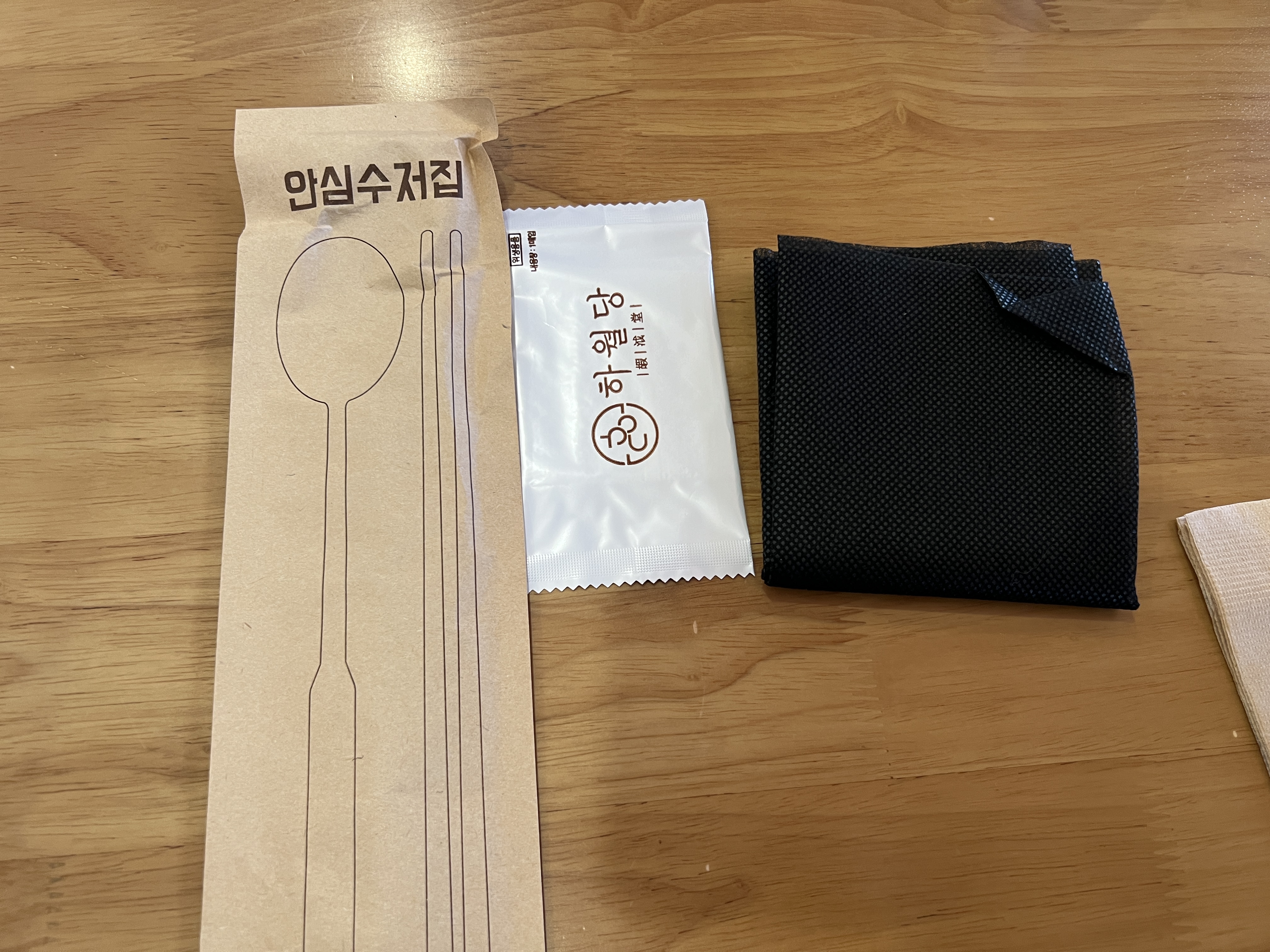 화이트 톤의 깔끔한 물병과 상차림, 그리고 수저는 따로 내어주며 앞치마와 물티슈 이렇게 내어준다.